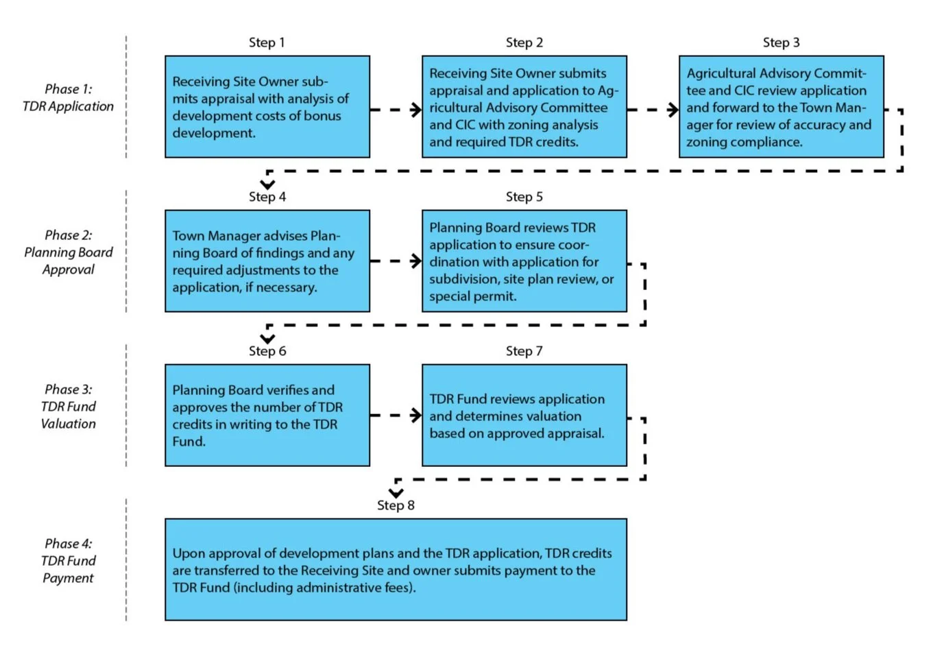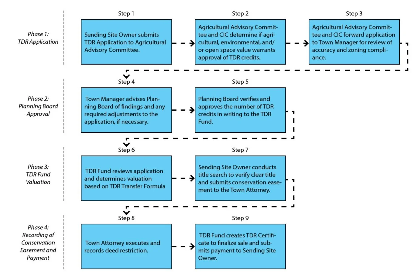 Transfer of Development Rights must be adopted in the Town’s zoning code to designate the Sending Area and Receiving Areas on the Town’s zoning map. The zoning code will also include specific development incentives in the Receiving Area.
