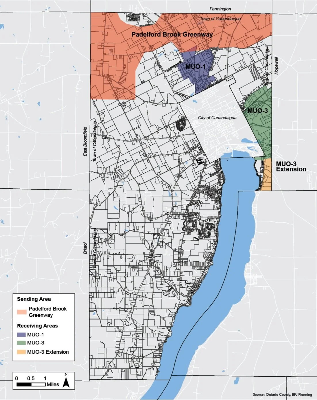 The overall objective of a potential TDR program in the Town of Canandaigua is to interlink concepts favored by the Town’s Comprehensive Plan, Agricultural Enhancement Plan, Padelford Brook Greenway Plan, and existing Incentive Zoning districts. The Town has expressed interest in preserving agricultural land and natural land through conservation as response to development pressure from single-family residential expansion. The Town also has existing Incentive Zoning in the Mixed-Use Overlay (MUO) Districts, which are used to promote future development in areas with existing infrastructure in close proximity to commercial centers.